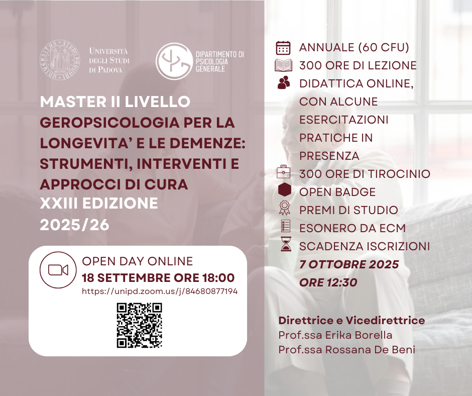Il Master fornisce conoscenze operative e strumenti per il lavoro con l’anziano con invecchiamento tipico o con disturbi cognitivi e neurodegenerativi e con chi se ne prende cura, in diversi contesti istituzionali, territoriali e domiciliari.