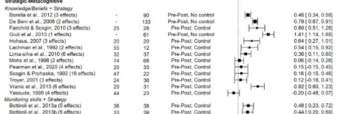 Nell’articolo pubblicato sulla rivista specializzata Aging & Mental Health abbiamo approfondito con una revisione sistematica e meta-analisi l’efficacia di programmi di potenziamento della memoria basati –unicamente– sulla metacognizione, o in combinazione con l’insegnamento e pratica di strategie di memoria, in anziani con invecchiamento tipico. Dei 3,487 articoli identificati tramite il metodo sistematico PRISMA, 25 articoli sono stati inclusi nella revisione sistematica e 23 studi sono stati considerati nella meta-analisi. I risultati hanno mostrato che sia i training di memoria basati su attività e processi metacognitivi (attività di riflessione e regolazione metacognitiva), sia i training strategico-metacognitivi (attività metacognitive in combinazione con l’insegnamento di mnemotecniche) producono benefici sulla prestazione in prove di memoria, modificando le credenze metacognitive, e migliorando l’utilizzo di strategie e l’autoefficacia nella propria memoria. I training strategico-metacognitivi hanno, poi, mostrato benefici promettenti anche sul benessere psicologico della persona anziana.